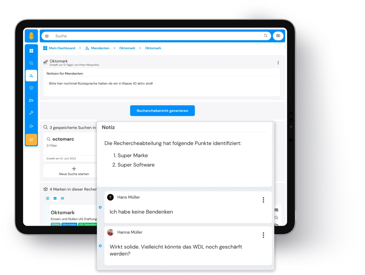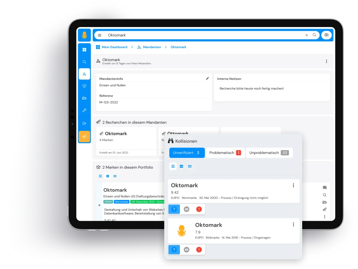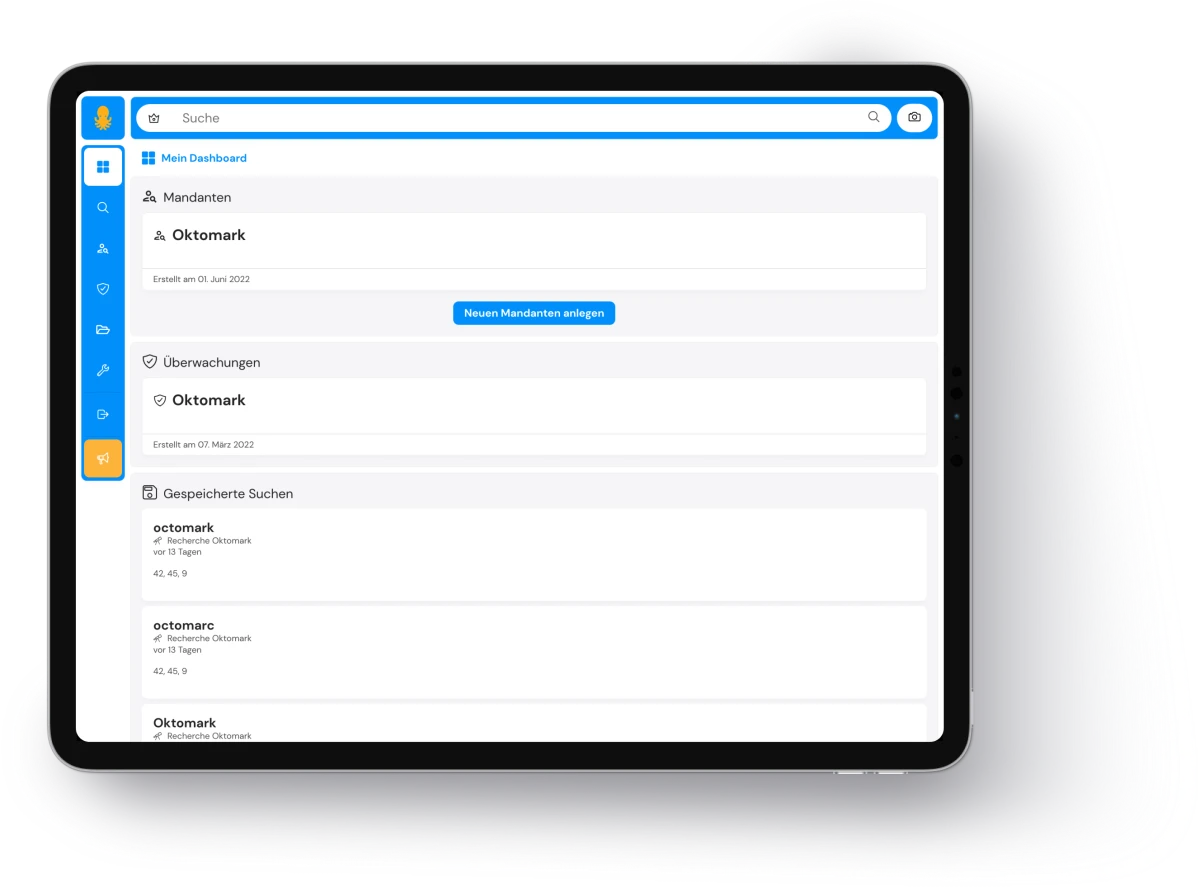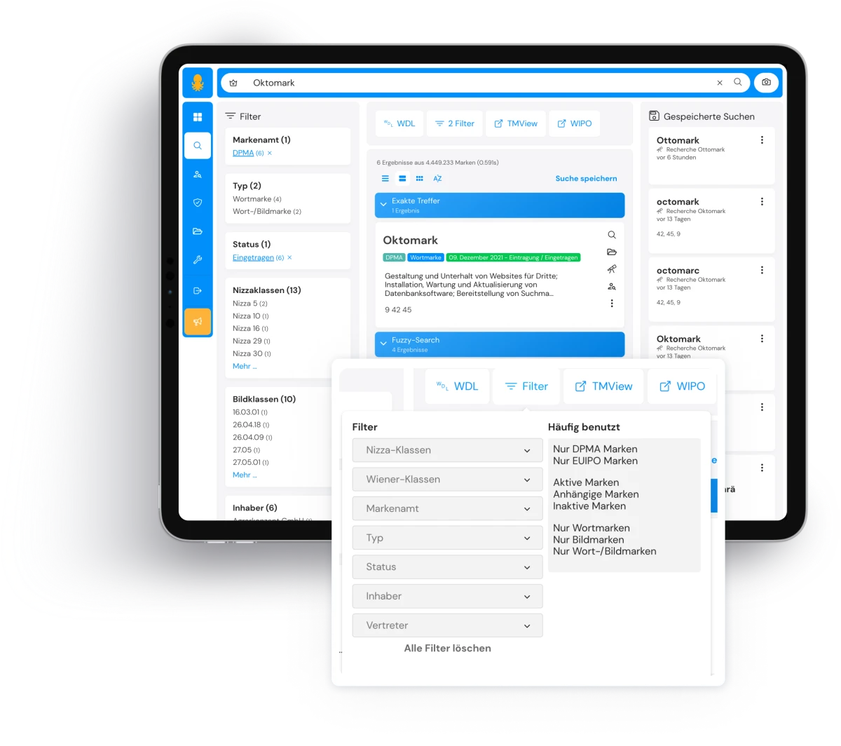 Oktomark ist speziell auf die Bedürfnisse und Workflows von Markenexperten angepasst, um Sie bei Ihrer täglichen Arbeit zu unterstützen und Ihnen Zeit zu sparen. Das fängt schon bei der Suche an. Machen Sie jetzt den Test: