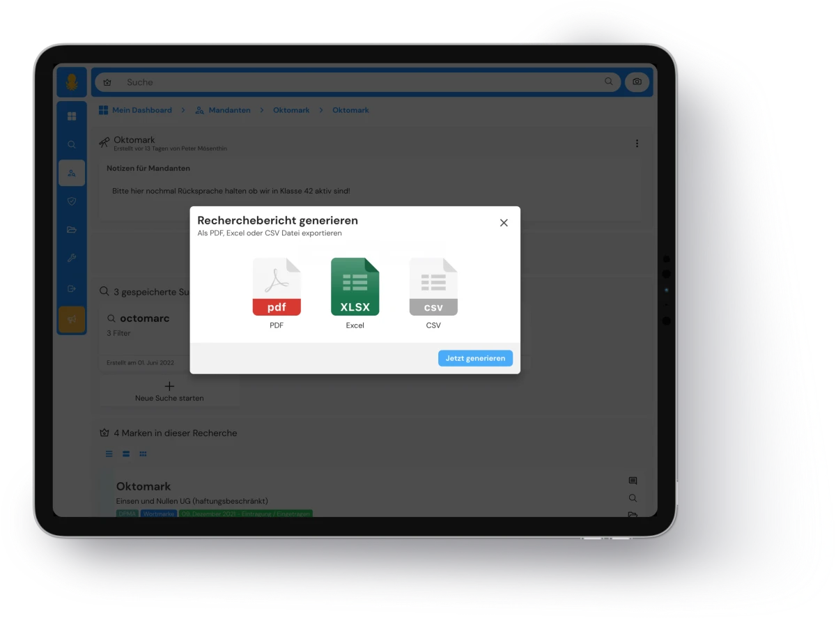 Alternativ können Sie Ihre Recherchen jederzeit als Excel oder CSV Datei herunterladen, um Sie mit Ihren Tools weiterzuverarbeiten.